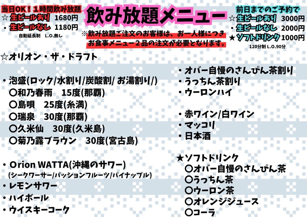 ※飲み放題をご注文のお客様は、お食事メニュー2品のご注文が必要となります。