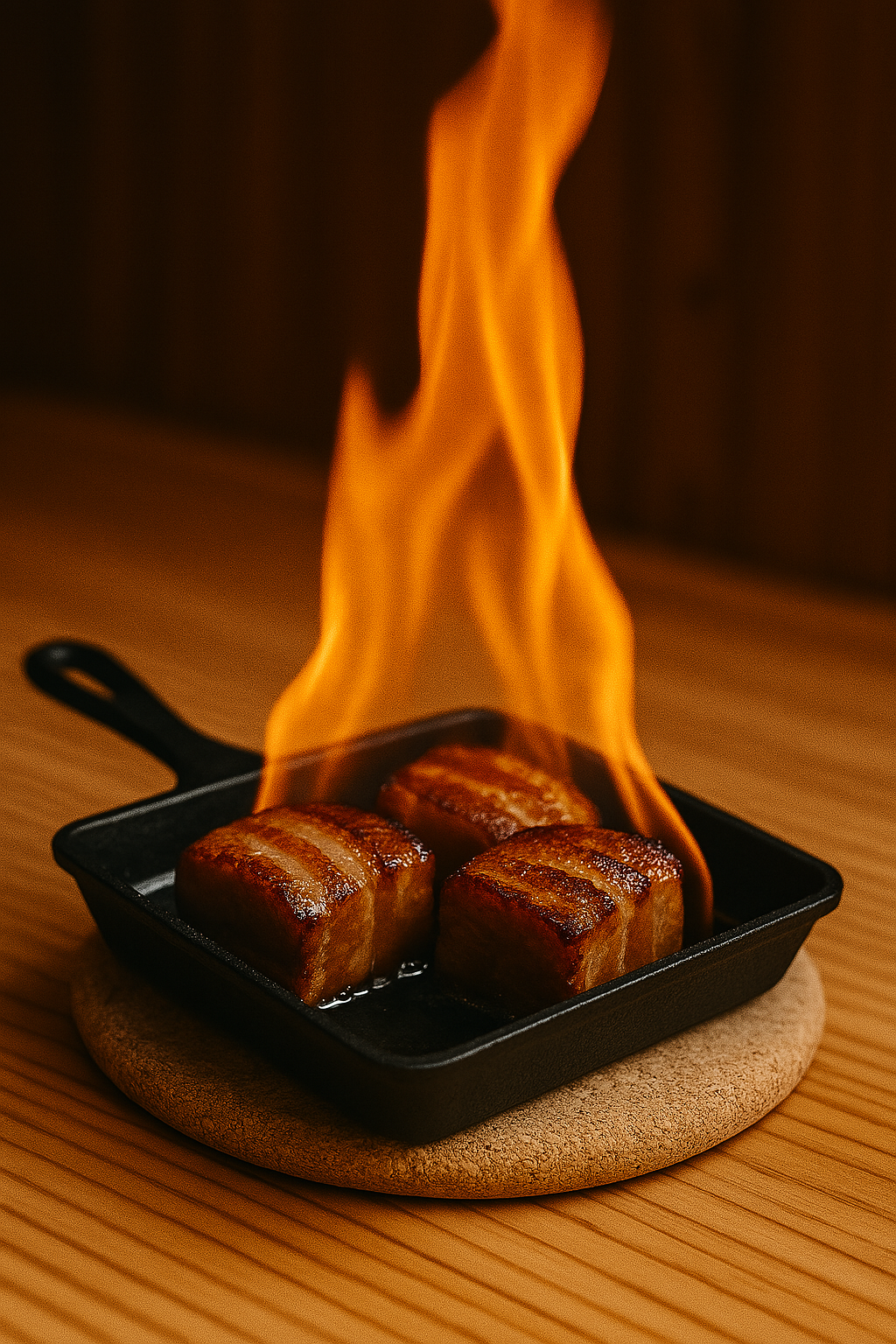 Tender, slow-braised Okinawan rafute is served on a sizzling iron skillet.