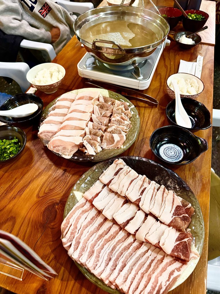 金アグー豚の芳醇な旨味、脂身の甘さを存分に楽しめる逸品です。 - 🥬 ネギ・ニラ・大根おろしを包んで食べる、新感覚のしゃぶしゃぶ