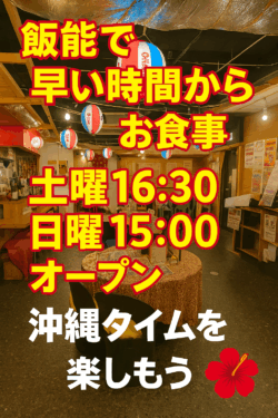 【飯能で早い時間からお食事】土曜16:30・日曜15:00オープン!早い時間から楽しむ沖縄タイムの魅力