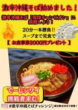 飯能に現れた最強の激辛チャレンジ!埼玉県飯能市に、本格沖縄料理と激辛チャレンジが融合した衝撃のメニューが登場しました。その名も「激辛沖縄そば 琉球チャンピオン」!琉球焼肉チャンピオン飯能苑が送り出すこの究極のチャレンジメニューは、ただの激辛...